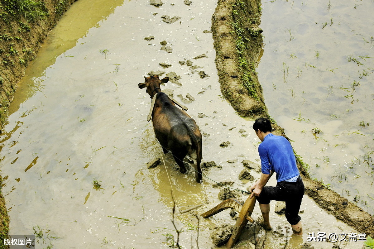 2.《雨水》:一场春雨至,万物方萌动。润物细无声,檐滴惊春梦。阡陌草初青,山坡赭变绿。吆牛惊林鸟,晨耕在田中。
