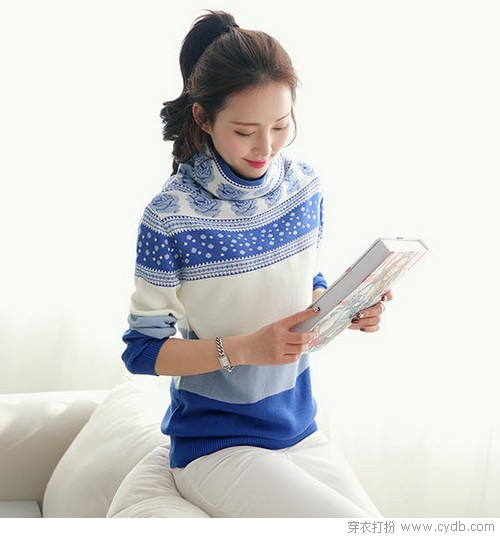 05 依然是针织衫与白色小脚裤的碰撞,和糖果色比起来青花瓷提花可能在清新俏皮上稍逊一筹,但骨子里散发的优雅从容也是纯色所不能比拟的。堆堆领不是为了保暖而是为了让针织衫更富有韵味。