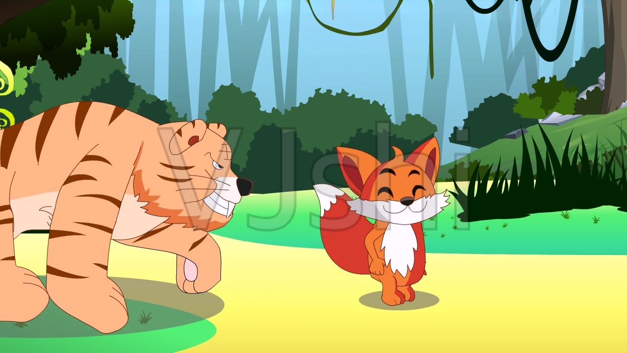 从前有一座美丽的大森林。这里大树茂密,还有绿油油的草地,颜色鲜艳的花朵,小鸟在枝头歌唱,小动物在草地嬉戏玩闹。而狐狸也住在这片美丽的森林里。有一天清晨,狐狸睡醒以后,发现肚子很饿,便出门到处觅食。找了很久也没有找到,正准备垂头丧气回家时,发现身后竟然出现了一只大老虎。狐狸眼珠子骨碌一转,扯着嗓子问老虎:“你敢吃我?”