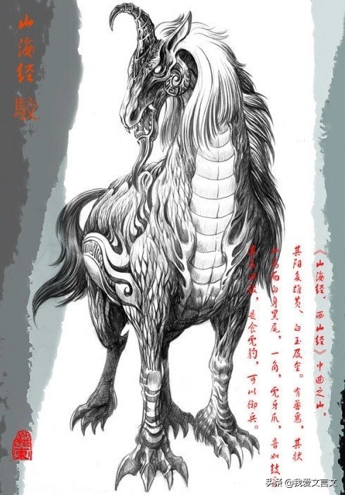 《山海经》中是这样描述的:“其状如马而白身黑尾,一角,虎牙爪,音如鼓音,其名曰驳,是食虎豹”,意思是“外形像马,有白色的身体和黑色的尾巴,一只角,长着老虎的牙齿和爪子,发出的声音如同击鼓的响声,名称是驳,是能吃老虎和豹子的”。