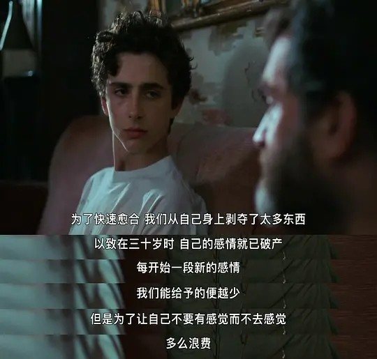 同时,影片中不乏各种象征与隐喻,对于细节的刻画是这部看似平淡的爱情电影的出彩之处。例如,奥利弗所佩戴的六芒星是犹太教的象征,犹太人的身份使得艾利奥在见面之初就对奥利弗有了一份亲近感,并且试图去接近他,在两人互表心意之后,艾利奥佩戴上了他之前不常戴的六芒星,还总是含在嘴里出神。模仿所爱之人的行为,想要更接近对方,恰是恋爱中的表现。爱情与欲望总是相辅相成的,这种暗示在影片里随处可见。风情弥漫的小镇、舞会上年轻的肉体、夏日果园里成熟的蜜桃、燥热的阳光与慵懒的午后,汇聚成欲望的结合体,爱情的伊甸园。再比如那场为人津津乐道的“桃戏”,更是一种情欲的暗示,淫而不秽,富有情趣,更将主角之间的感情拔到一个崭新的高度:艾利奥抱着奥利弗哭泣,因为奥利弗的举动,让他感受到自己是完全被人爱着,自己的一切都被人所接受,为此而感动落泪。这段感情也注定不会再是他生命中的一个小插曲,他将用余生来怀念。在这部剧情平淡、节奏舒缓的电影中,这些微小的戏剧冲突、各种伏笔以及细腻的人物刻画都为这个故事的诞生与发展作了合理的修饰,以至于能让人忽略性别的界限,在其中找到共鸣。
