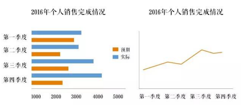 如果业绩还不错,多使用图表,将优势数据与年初的目标对比展示,让老板第一时间看到你的出色成绩。
