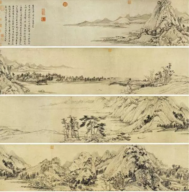 《富春山居图》长639.9厘米,高33厘米,用水墨技法描绘富春江一带的初秋景色。