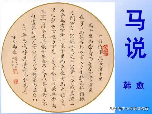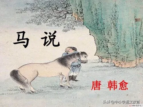 《马说》是唐代文学家韩愈的一篇借物寓意的杂文,属论说文体,原为韩愈所作《杂说》的第四篇,“马说”这个标题为后人所加。此文作于贞元十一年(795年)至十六年(800年)间。“说”是“谈谈”的意思,是古代一种议论文体裁。这篇文章以马为喻,谈的是人才问题,流露出作者愤世嫉俗之意与怀才不遇的感慨与愤懑之情。表达了作者对封建统治者不能识别人才、不重用人才、埋没人才的强烈愤慨。